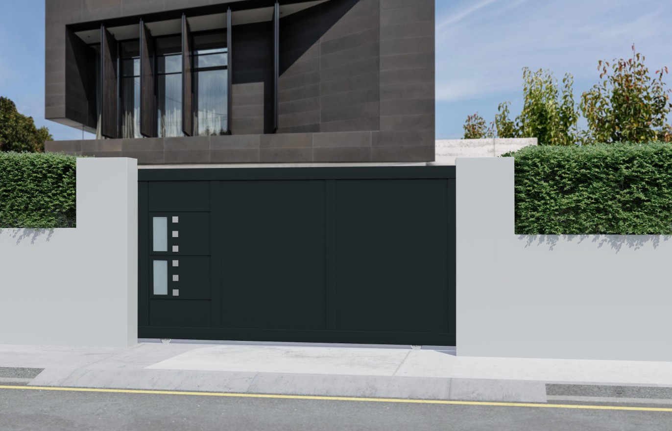 Le portail aluminium coulissant TANIA est plein. Il est composé d'un remplissage de lames horizontales et d'un remplissage de panneau décor avec 5 carrés en alunox et de 2 double vitrage dépoli et de 3 rainures (toujours coté gâche et de largeur fixe de 740mm), son esthétique n'est pas sans rappeler votre porte d'entrée ou votre porte de garage tout l'intérêt de la gamme Premium Urban Harmonie. Il est motorisable si vous le souhaitez et prêt à poser avec l'ensemble des accessoires fournis pour sa pose sur piliers.